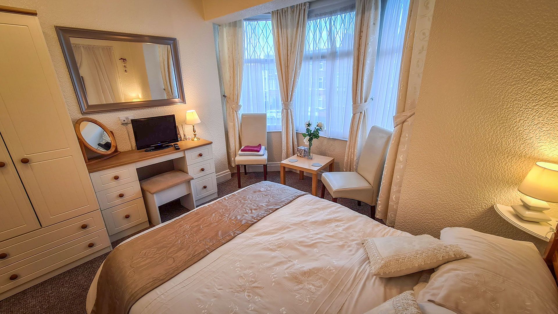 A light clean double room on the first floor facing the front of the building. Unwind and relax in the chairs in the bay window watching the world go by.
